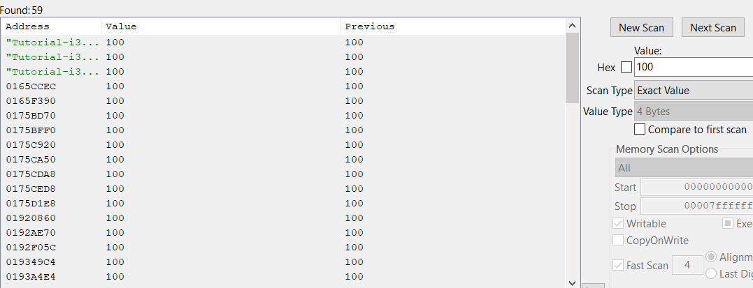 Zakładając, że szukasz wartości 100, przeprowadzasz skanowanie w poszukiwaniu tej wartości i znajdujesz wiele trafień: