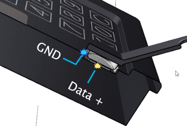 Gdy klucz dotrze do czytnika, styki stykają się i klucz jest zasilany, aby przesłać swoje ID. Czasami klucz nie jest odczytywany od razu, ponieważ PSD styku interkomu jest większy niż powinien być. W takim przypadku zewnętrzne kontury klucza i czytnika nie mogły się dotknąć. Jeśli tak się stanie, będziesz musiał przycisnąć klucz do jednej ze ścianek czytnika.