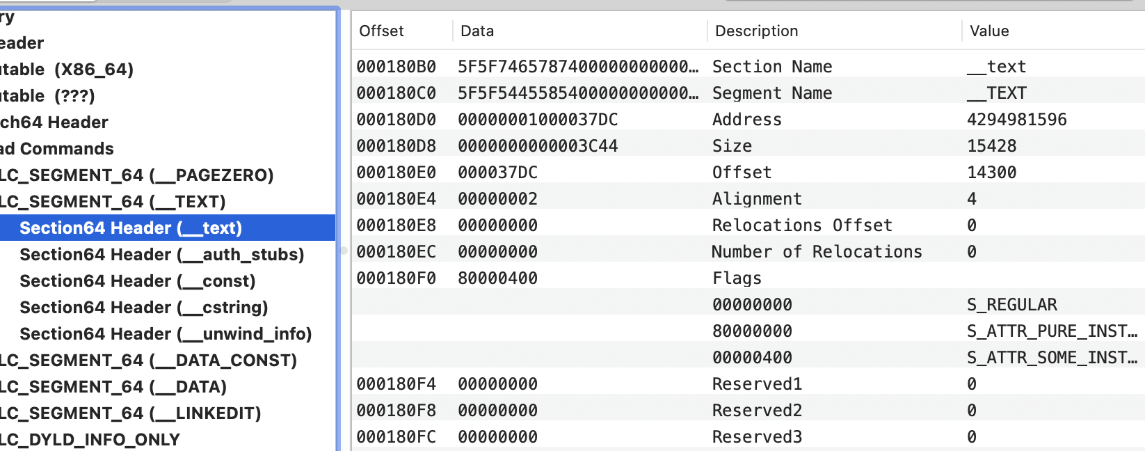 -pagezero_size) para cobrir os primeiros 4k e deixando o restante da memória 32bit acessível tanto em modo usuário quanto em modo kernel. __TEXT: Contém código executável com permissões de leitura e execução (não gravável). Seções comuns deste segmento:__text: Código binário compilado__const: Dados constantes (somente leitura)__[c/u/os_log]string: Constantes de string C, Unicode ou de logs do os__stubsand__stubs_helper: Envolvidas durante o processo de carregamento de bibliotecas dinâmicas__unwind_info: Dados de unwind da pilha- Note que todo esse conteúdo é assinado, mas também marcado como executável (criando mais opções para exploração de seções que nem necessariamente precisam desse privilégio, como seções dedicadas a strings).