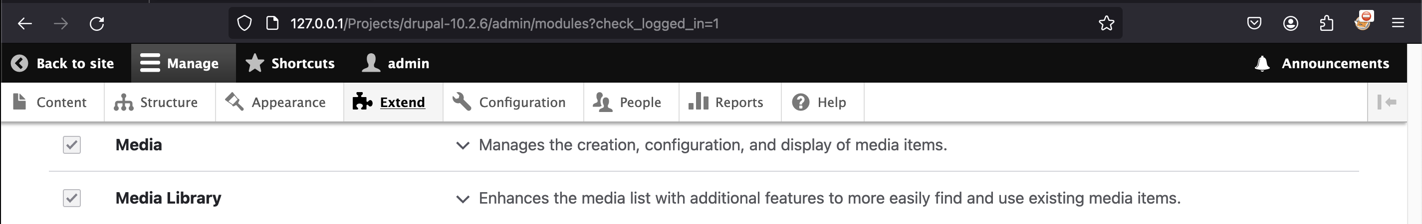 No menu Extend (/admin/modules), você pode ativar o que aparentam ser plugins já instalados. Por padrão, os plugins Media e Media Library não parecem estar ativados, então vamos ativá-los.