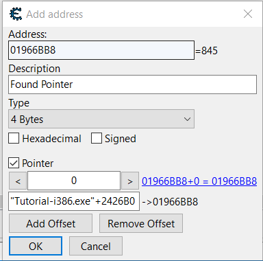 Agora, clique na caixa de seleção “Ponteiro” e adicione o endereço encontrado na caixa de texto (neste cenário, o endereço encontrado na imagem anterior foi “Tutorial-i386.exe”+2426B0):