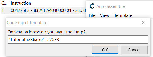 Sada, kliknite na kvačicu “Pointer” i dodajte pronađenu adresu u tekstualno polje (u ovom scenariju, pronađena adresa na prethodnoj slici je bila “Tutorial-i386.exe”+2426B0):