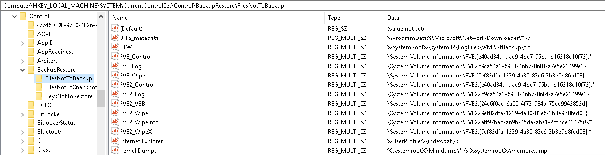 Kichupo cha rejista HKEY_LOCAL_MACHINE\SYSTEM\CurrentControlSet\Control\BackupRestore kina faili na funguo za kutokuweka akiba: