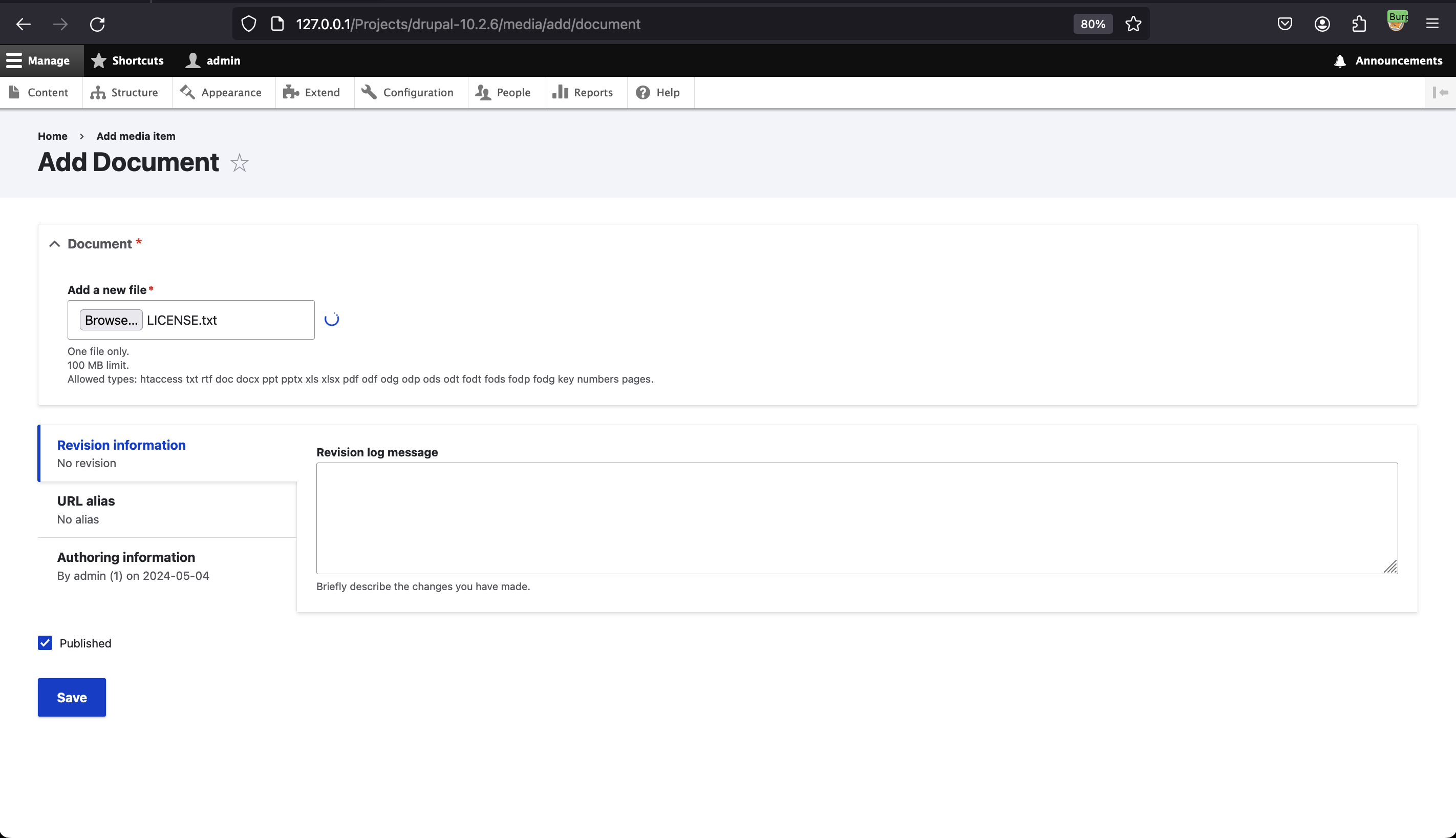 First, we leverage the Add Document (/media/add/document) feature to upload our file containing the Apache directives (.htaccess).