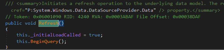 Kwa kutumia dnSpy unaweza kuchunguza msimbo wa darasa tunalolihusu. Katika picha hapa chini tunaona msimbo wa PresentationFramework.dll –> System.Windows.Data –> ObjectDataProvider –> Method name