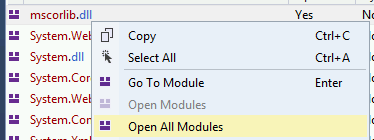 Sasa kwamba tunafuatilia mchakato, ni wakati wa kuusitisha na kupakia moduli zote. Kwanza bonyeza Debug >> Break All kisha bonyeza Debug >> Windows >> Modules: