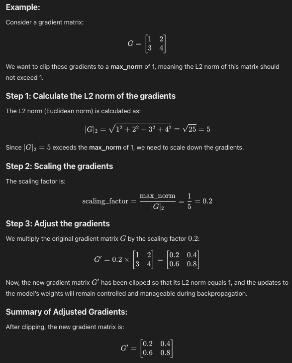 max_normdeğerini aştığında, modelin parametrelerine yapılan güncellemelerin yönetilebilir bir aralıkta kalmasını sağlamak için orantılı olarak ölçeklendirilir, bu da patlayan gradyanlar gibi sorunları önler ve daha kontrollü ve istikrarlı bir eğitim sağlar.Bu iyileştirmenin önceki kodda yer almadığını unutmayın.