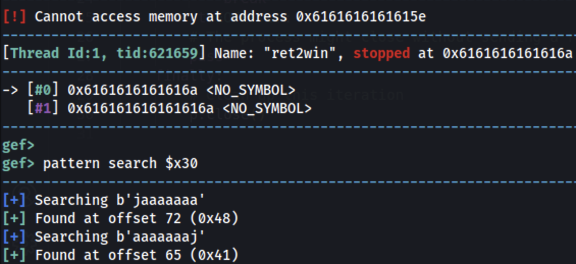 arm64, register x30’taki (bozulmuş) adrese dönmeye çalışır; bunu pattern offset’i bulmak için kullanabiliriz: