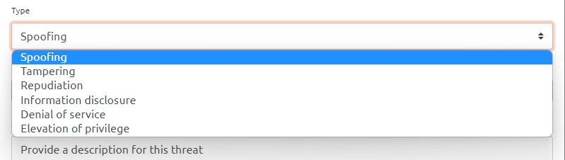 Aktör Tehditleri ile Süreç Tehditleri arasında bir fark olduğunu unutmayın. Eğer bir Aktöre tehdit eklerseniz, yalnızca “Sahtecilik” ve “Reddetme” seçeneklerini seçebilirsiniz. Ancak örneğimizde bir Süreç varlığına tehdit eklediğimiz için tehdit oluşturma kutusunda bunu göreceğiz: