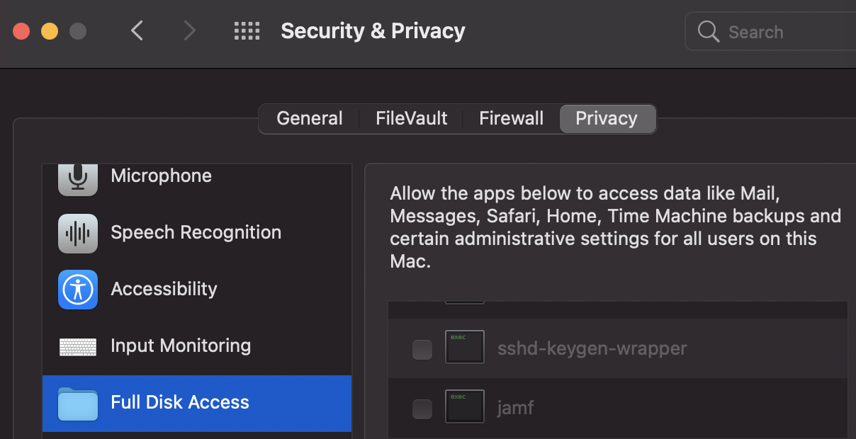 Varsayılan olarak, SSH üzerinden erişim “Tam Disk Erişimi” gerektiriyordu. Bunu devre dışı bırakmak için, listede yer alması ancak devre dışı bırakılması gerekir (listeden kaldırmak bu ayrıcalıkları kaldırmaz):