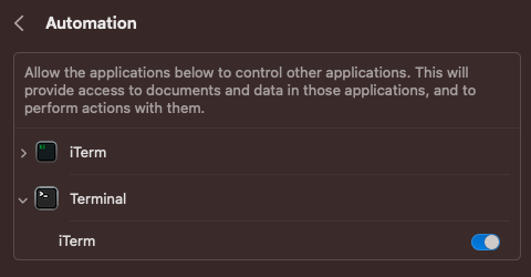 Örneğin, bir Uygulama iTerm üzerinde Otomasyon iznine sahipse, bu örnekte Terminal iTerm üzerinde erişime sahiptir: