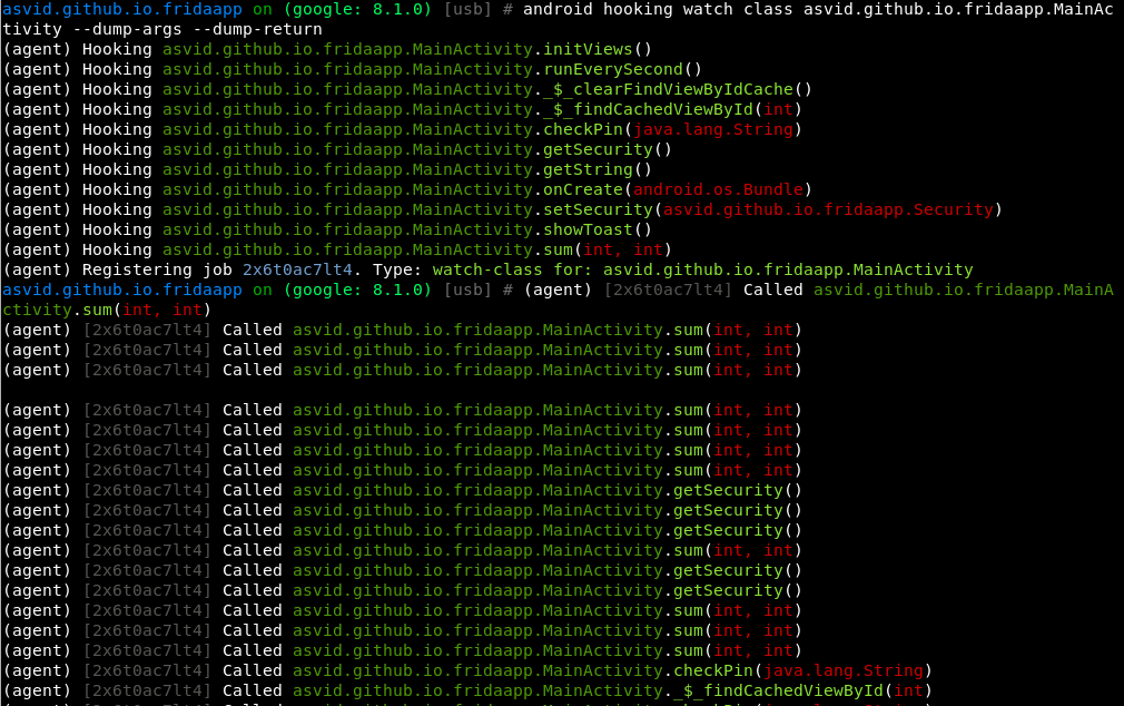 android hooking watch class asvid.github.io.fridaapp.MainActivity --dump-args --dump-return