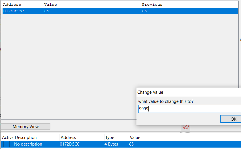 Sonra, değerin değişmesi için bir şey yapıyorsunuz ve oyunu durdurup bir sonraki taramayı gerçekleştiriyorsunuz: