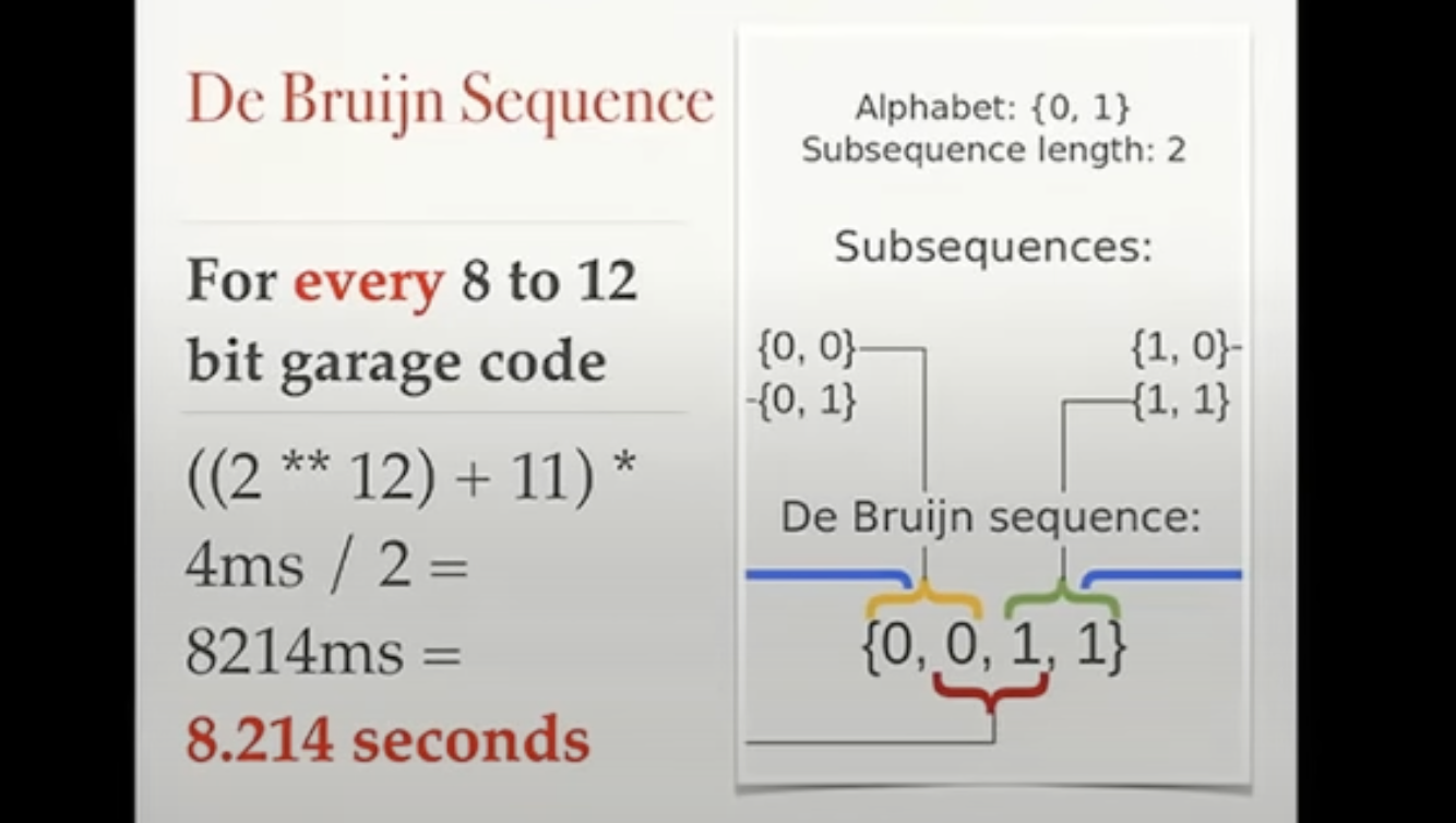 Ayrıca, De Bruijn Dizisi kullanarak (tüm potansiyel ikili sayıların gönderilmesi için gereken bit sayısını azaltmanın bir yolu) bu süre sadece 8 saniyeye düşer: