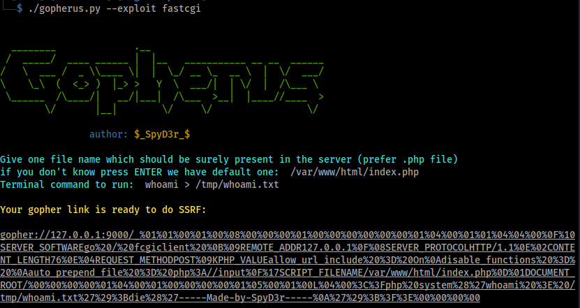 Використовуючи Gopherus, ви можете згенерувати payload для надсилання до FastCGI слухача та виконати довільні команди: