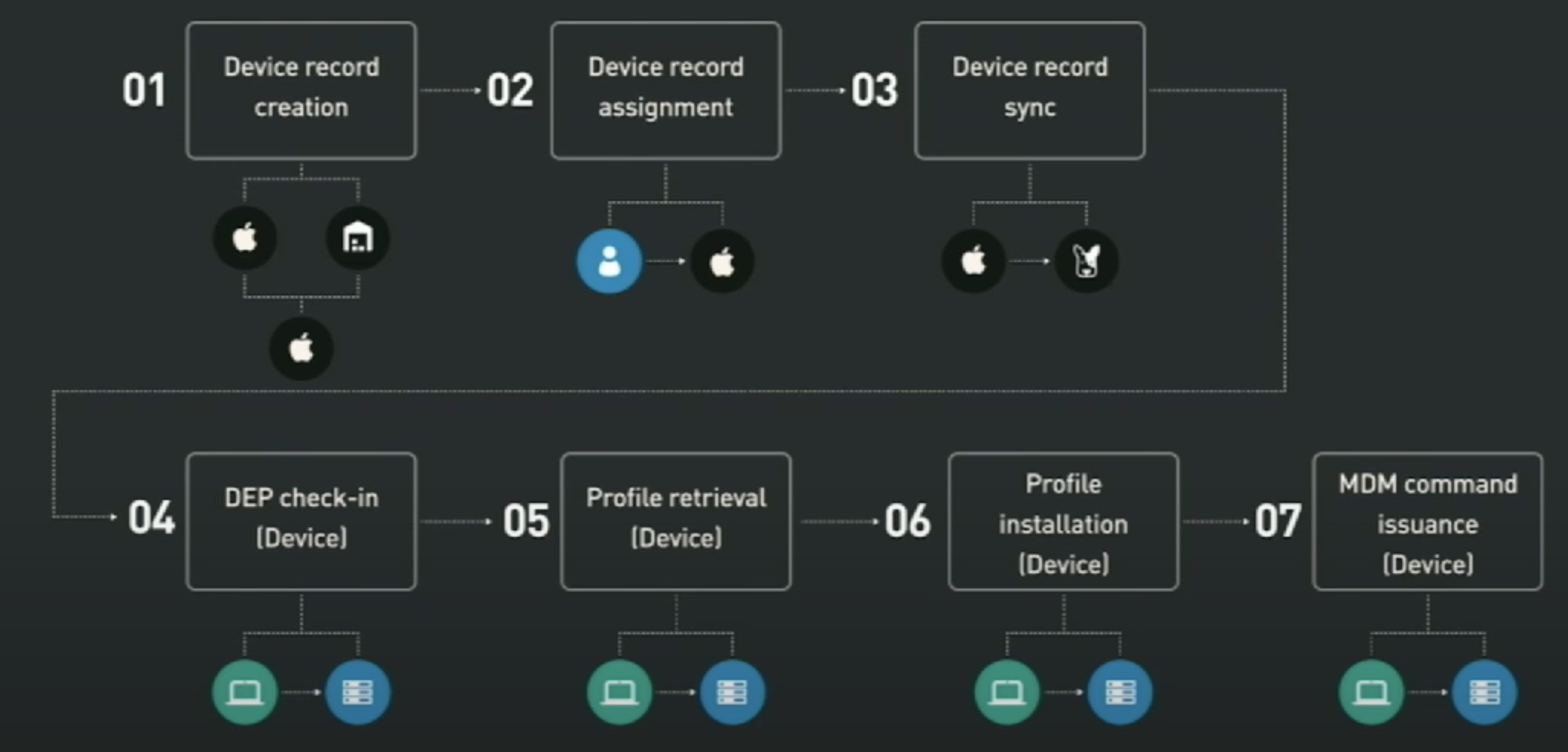 - 设备记录同步(MDM 供应商):MDM 同步设备记录并将 DEP 配置文件推送到苹果