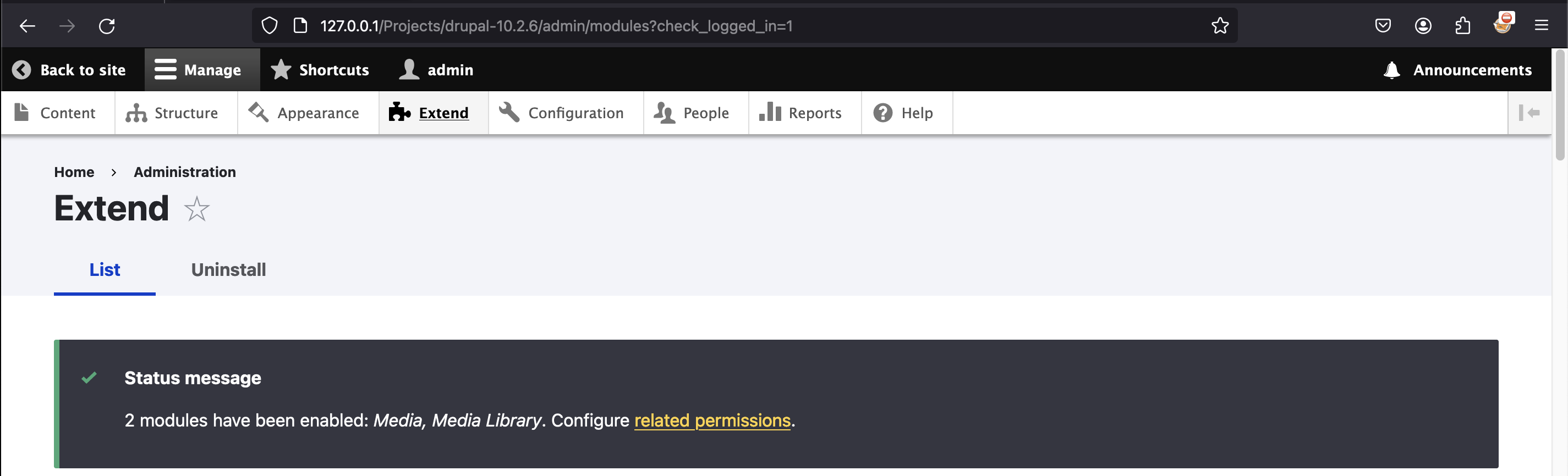 在 Extend 菜单 (/admin/modules) 中,您可以激活看起来已安装的插件。默认情况下,插件 Media 和 Media Library 未被激活,因此我们将激活它们。