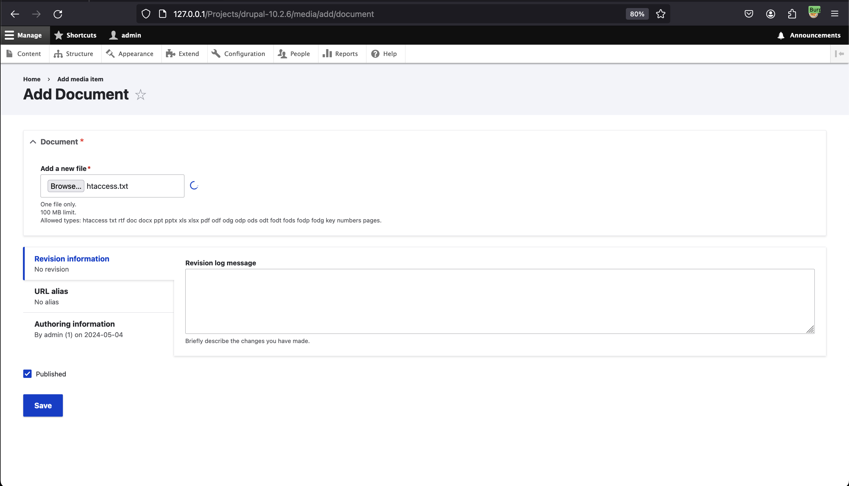首先,我们利用 Add Document (/media/add/document) 功能上传包含 Apache 指令的文件(.htaccess)。