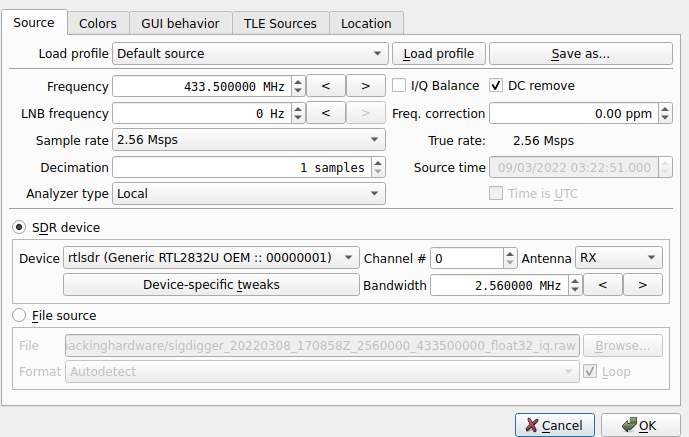 在设置(第二个标签按钮)中,您可以选择SDR设备或选择一个文件进行读取,以及要调谐的频率和采样率(如果您的PC支持,建议最高可达2.56Msps)。